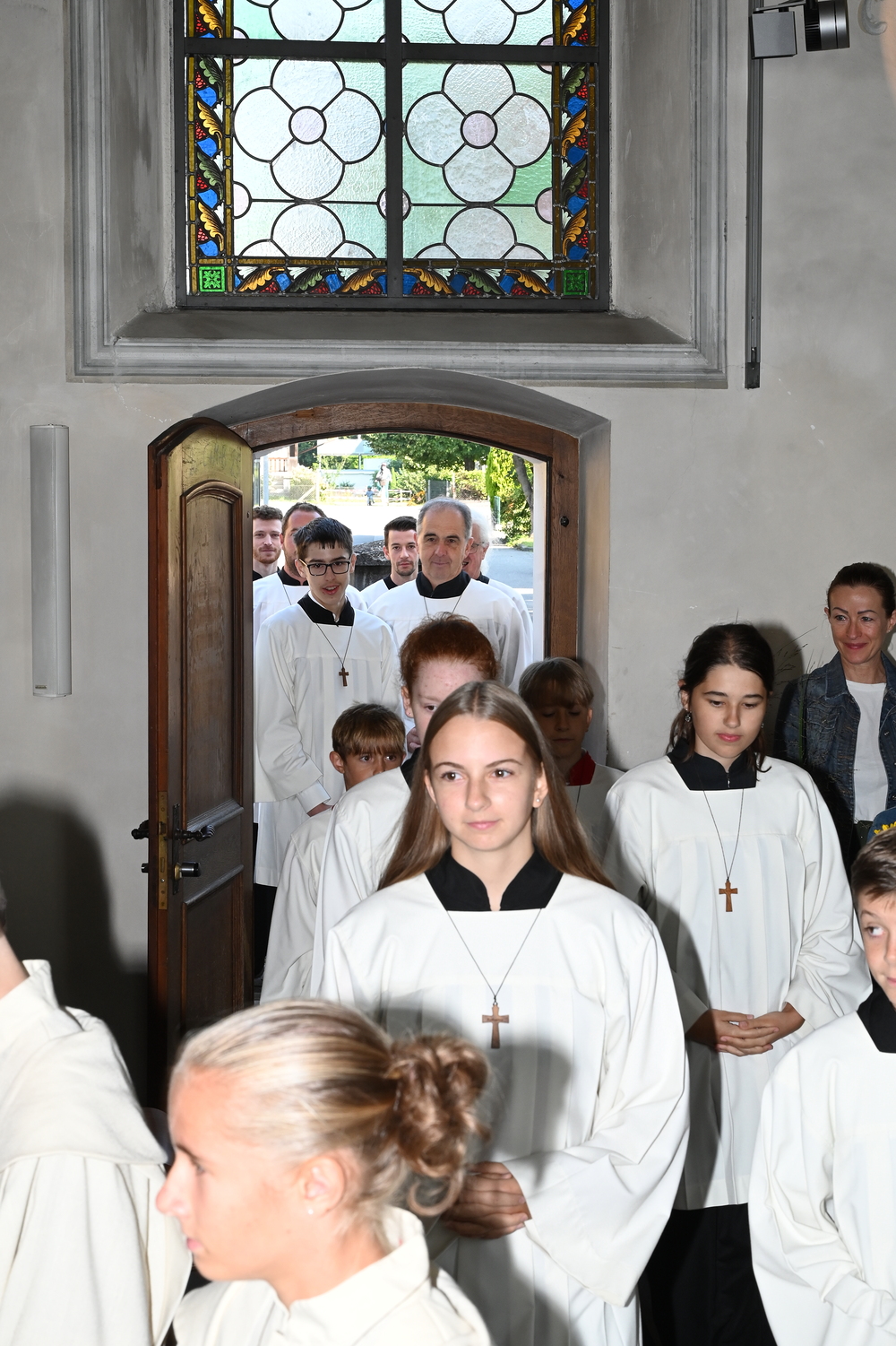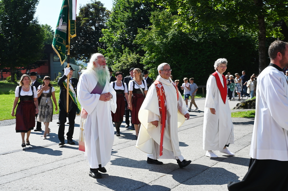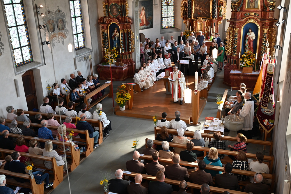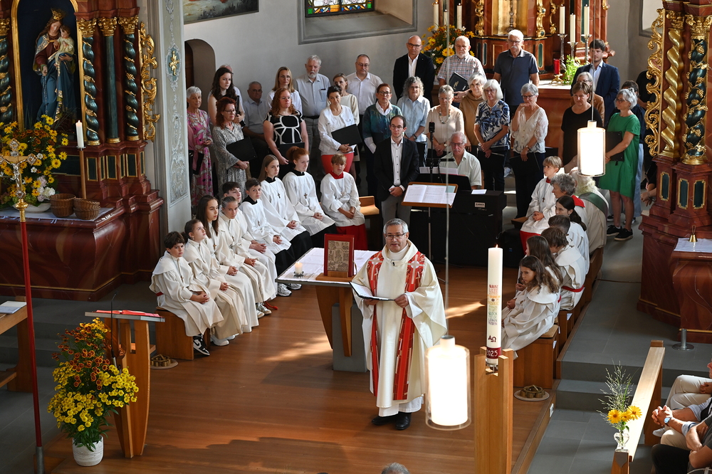 Das Gotteshaus war bis auf den letzten Platz gefüllt, als die Ministrantinnen und Ministranten, Ehrenamtliche, Mesner, Diakon, Pastoralassistentin und Pfarrer Romeo einzogen – sinnbildlich und als Hinweis auf das Tagesevangelium durch den schmalen Seiteneingang. Den Volksgesang beim Ein- und Auszug des Festgottesdienstes begleitete der Bürgermusikverein Mäder, zur Kommunion erklang der Choral „Abide with me“. Die „Latin Jazz Mass“ von Martin Völlinger wurde vom Kirchenchor Mäder, dem Magnus Chor Röns, Ingold Breuss am Keyboard unter der Leitung von Clemens Breuss fetzig-fröhlich dargeboten.