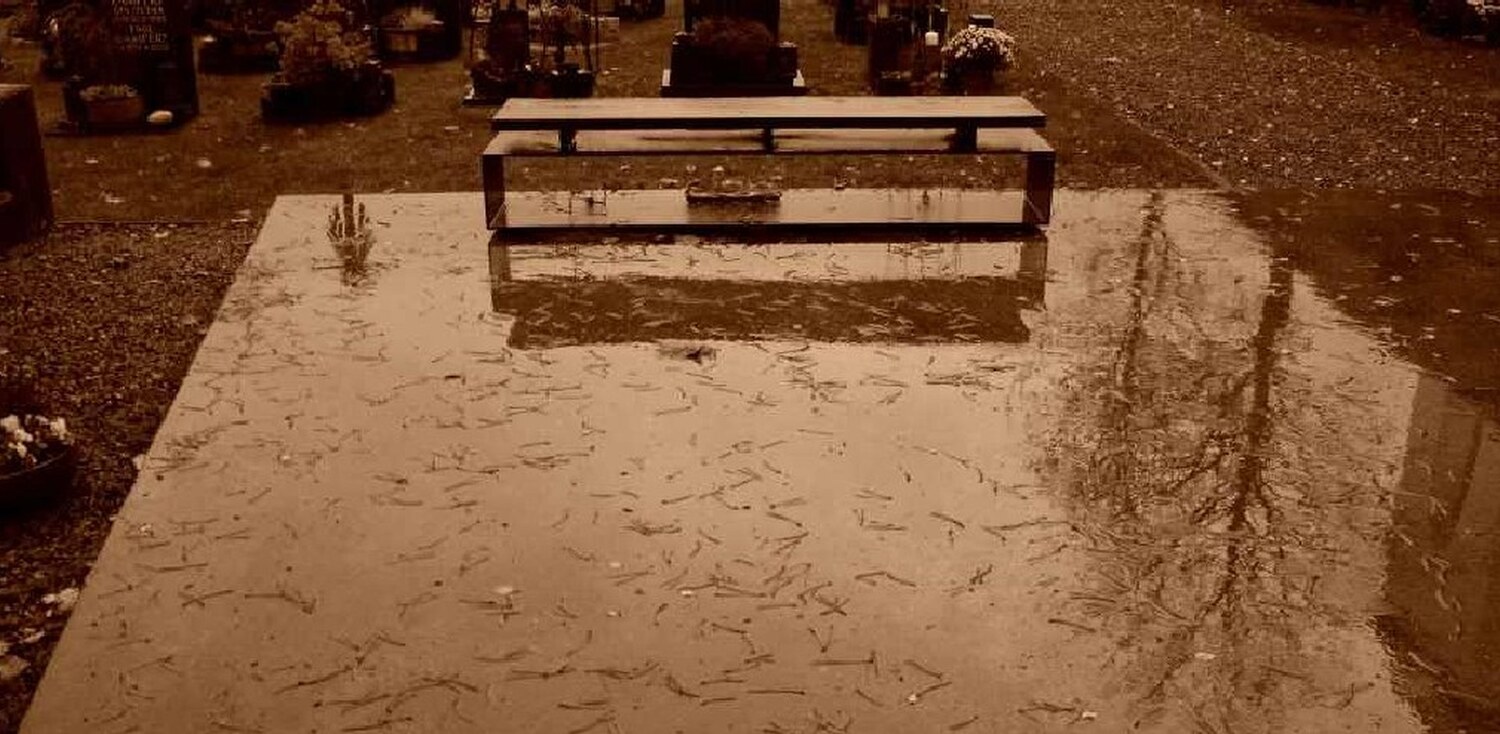 Auf dem Friedhof, im Moment des Fotos, bei starkem Regen, bläst eine Windböe in meine Ärmel.
